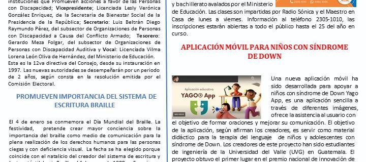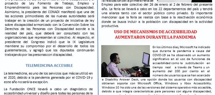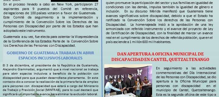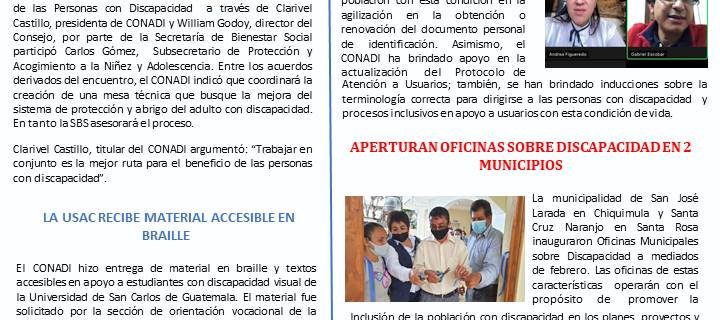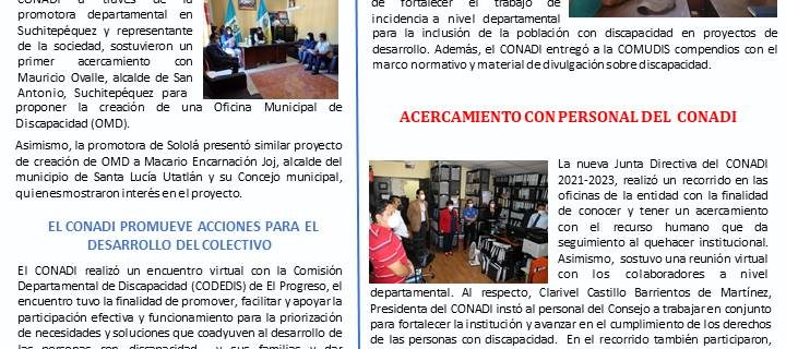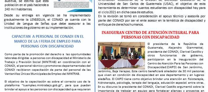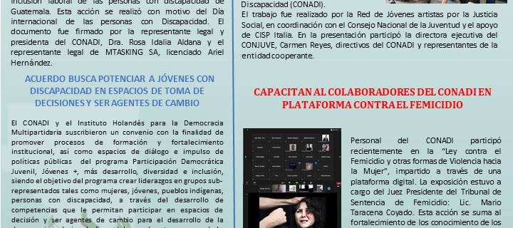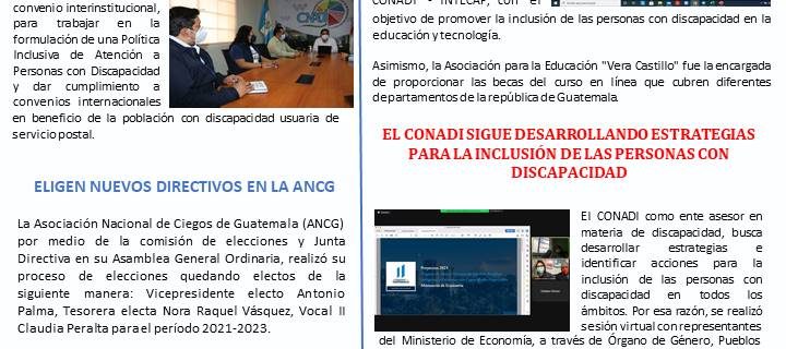 Conoce lo más relevante sobre los asuntos de discapacidad, con las noticias generadas por el CONADI y organizaciones de y para personas con discapacidad. A través del Boletín Informativo No. 02- 2021 y en su formato accesible a través de: CONADI NOTICIAS VERSIÓN AUDIBLE