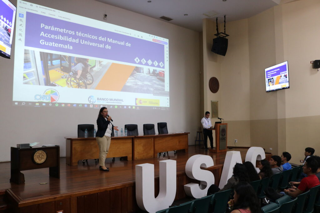 William Guamuch, técnico del Servicio Nacional de Discapacidad, se enfocó en la socialización del Manual de Accesibilidad Universal, una herramienta de apoyo elaborada por el CONADI con el apoyo del Banco Mundial que busca orientar a los planificadores y/o ejecutores de proyectos; con parámetros técnicos, lineamientos y recomendaciones para lograr espacios, edificaciones y entornos accesibles para todas las personas, independientemente de su condición.